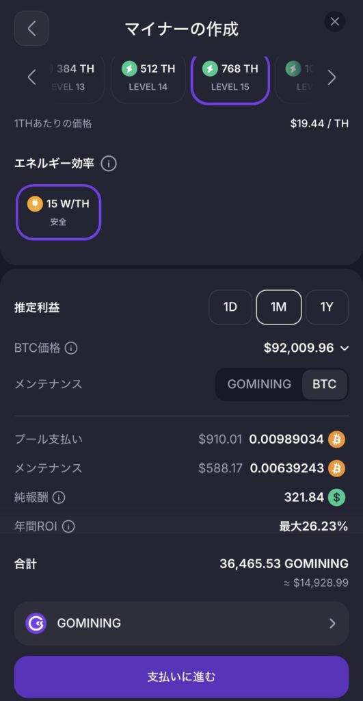ビットコイン価格が$92,009.96=¥14,618,726の時点で、192〜768TH 15W/THのNFTマイナーになります。